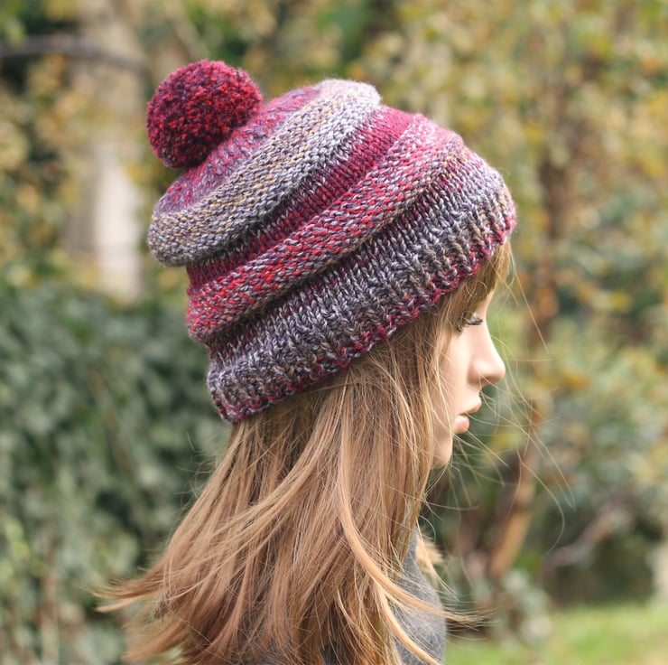 HAT knitted burgundy purple grey red chunky Folksy Very well made.